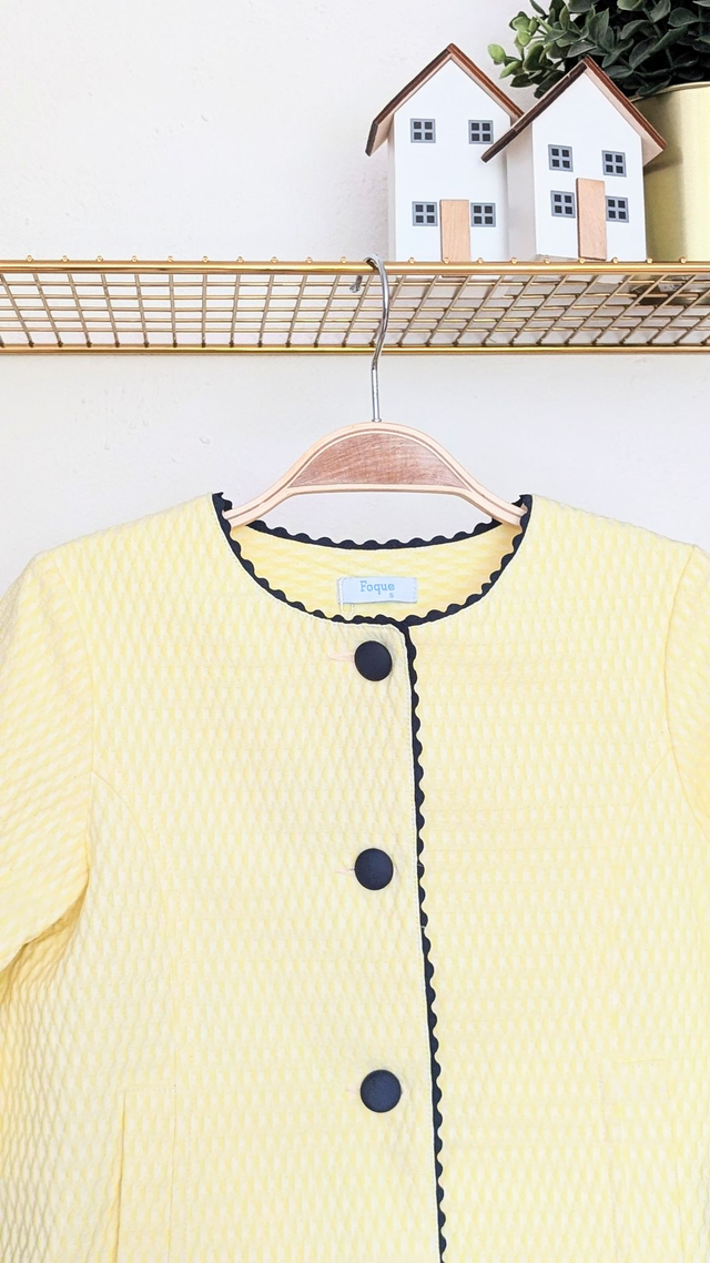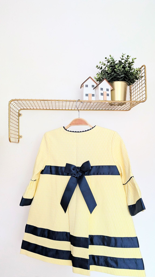 Jaune pâle avec finitions en satin bleu marine